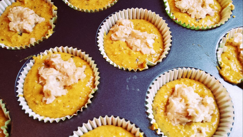 - Samaisi atsevišķa bļodā kopā auzu pārslas, medu un kokosriekstu eļļu un uzliec katram mafinam pa virsu.